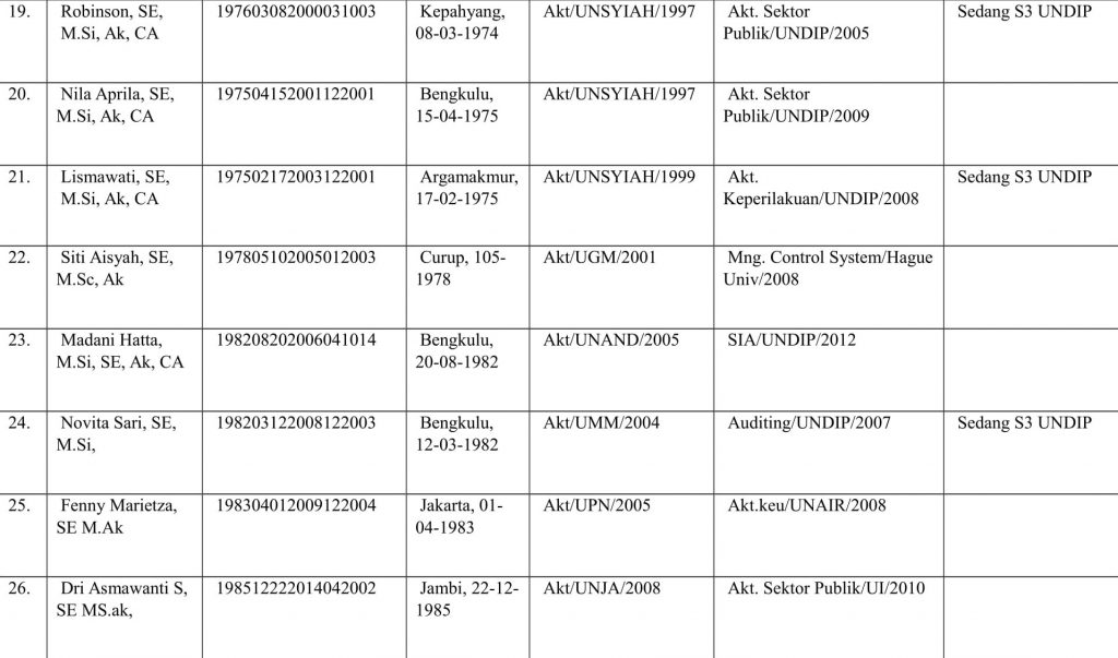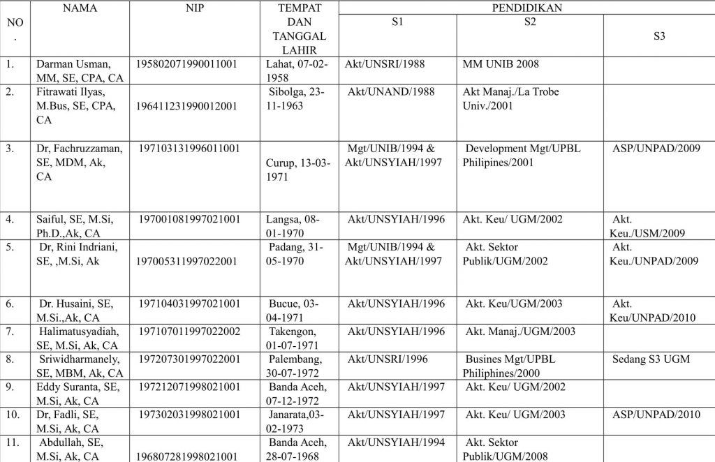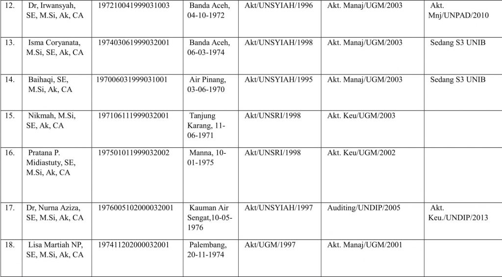 Daftar Staf Pengajar Program Studi Akuntansi Universitas BengkuluDiposting oleh | Jul 28, 2017 | Berita | 0 |