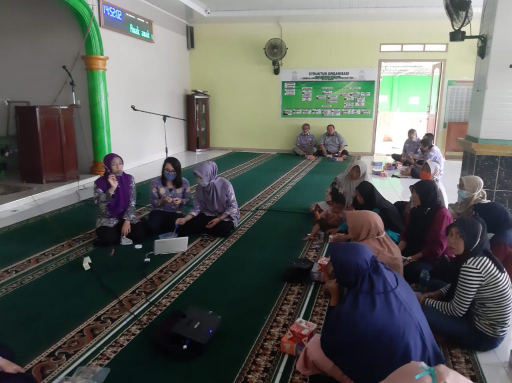 Kegiatan dilakukan mulai pukul 13.30 WIB hingga pukul 15.15 WIB. Dalam kegiatan ini dilakukan penyuluhan dan praktek pembuatan aksesoris dalam bentuk konektor masker. Kegiatan ini dimaksudkan sebagai bentuk sosialisasi kewajiban penggunaan masker juga sebagai alternatif pemasukan rumah tangga. Para peserta langsung praktek membuat konektor menggunakan bahan manik-manik sekaligus diajari pengemasan barang yang menarik sehingga memiliki nilai jual lebih.